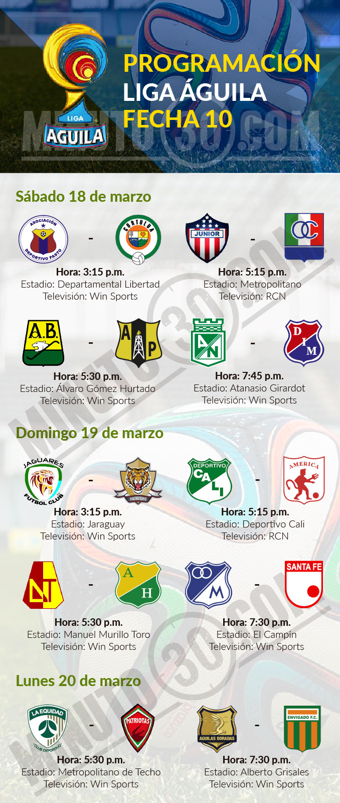 Minuto30.com- La Dimayor dio a conocer este jueves la programación de la décima fecha de la Liga Águila I-2017, en la que se disputarán los clásicos regionales. El juego entre Atlético Nacional e Independiente Medellín se jugará el sábado 18 de marzo a las 7:45 de la noche, en el Estadio Atanasio Girardot. La programación […]