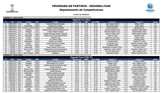 Minuto30.com- La Conmebol dio a conocer la programación para los partidos de la segunda fase de la Copa Sudamericana, en la que estarán  en acción cinco equipos de Colombia. Uno de ellos es Atlético Nacional que tendrá como rival en esta serie a Fluminense. El partido de ida se cumplirá el jueves 23 de mayo, a […]