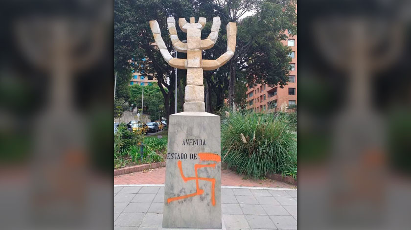 El monumento de La Menorá, de gran simbolismo para el judaísmo, ubicado en la calle 94 con carrera 11 en Bogotá, fue vandalizado en la noche del 31 de octubre por delincuentes que grafitearon una esvástica en su base y tacharon el nombre de Israel.