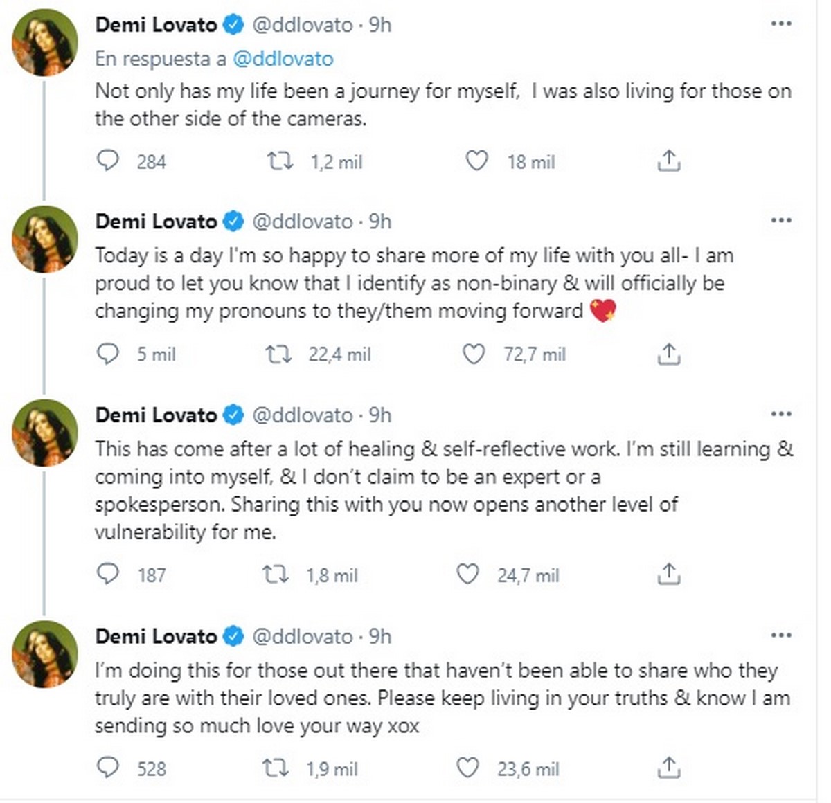 Demi Lovato anunció que se identifica con el género no binario. A través de su cuenta de Twitter manifestó que se siente “feliz de compartir más de mi vida con todos ustedes”.