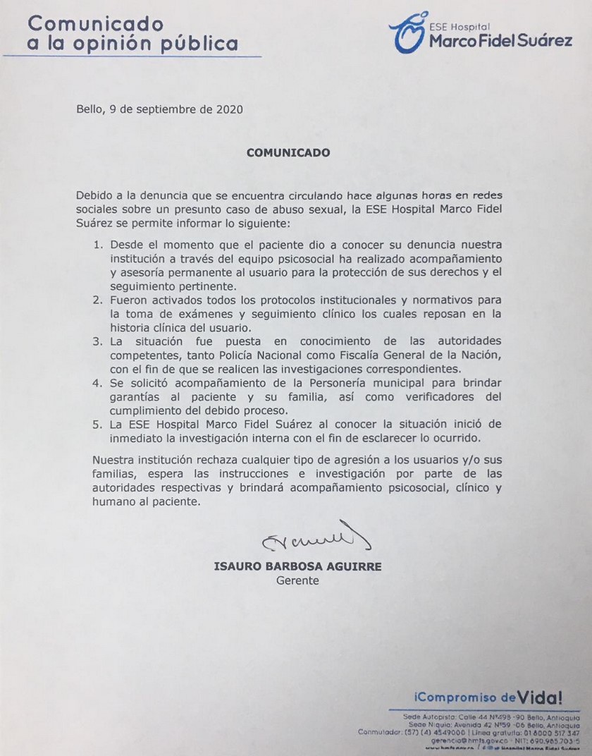 Por medio de un video que fue publicado en redes sociales, un paciente denunció que fue víctima de una agresión sexual por parte de un enfermero en las instalaciones del Hospital Marco Fidel Suárez del municipio de Bello.