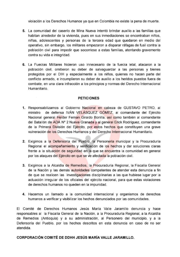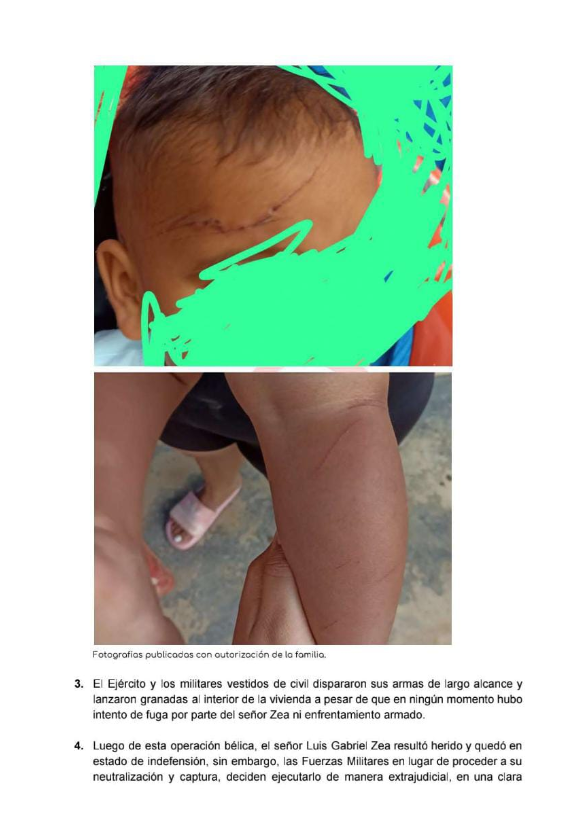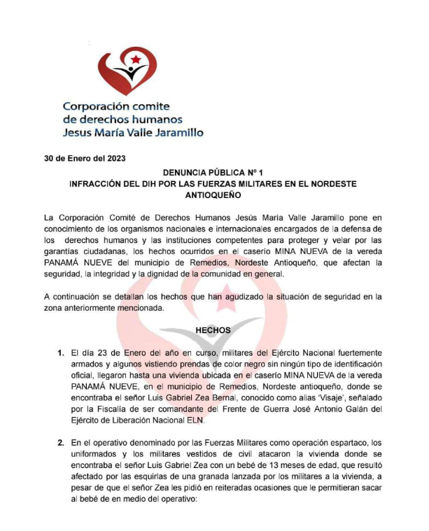 En un comunicado oficial el comité indicó, “en el operativo denominado por las Fuerzas Militares como operación ‘Espartaco’, los uniformados y los militares vestidos de civil atacaron la vivienda en la que se encontraba Luis Z. (alias “Visaje” señalado por la Fiscalía de ser comandante del frente de guerra ‘José Antonio Galán’ del ELN) con el bebé”.