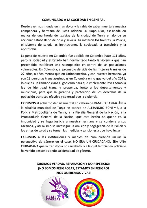 Por su parte, los activistas aseguran que ninguna acción violenta se justifica y exigieron a las autoridades investigar el caso, “que este hecho no quede no quede en la impunidad, y se haga justicia a nuestra hermana y se condene a sus asesinos y así mismo se investigue la omisión y negligencia de la Policía, los entes de salud y se tomen medidas y sanciones a que haya lugar”.