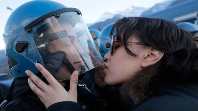 La joven italiana Nina de Chiffre besó a un agente antidisturbios durante una manifestación contra el Tren de Alta Velocidad en Turín. Ahora, la estudiante de 20 años de edad enfrenta una acusación de “violencia sexual y de insultar a un funcionario público” después de que el sindicato de la policía italiana (COISP) dictaminara que el acto era acoso sexual.