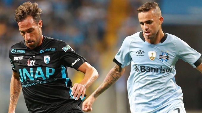 El jugador Luan Vieira (d) de Gremio disputa el balón con Tómas Patricio Charles (i) de Iquique, el pasado martes 11 de abril de 2017, durante un juego de la Copa Libertadores. EFE/Archivo