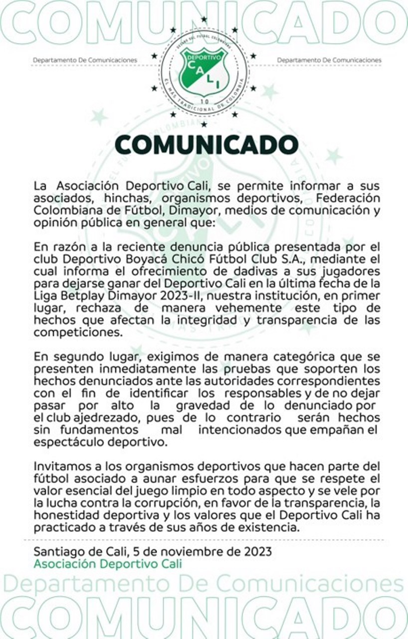 En comunicado emitido por el Deportio Cali además se rechazaron las declaraciones del equipo de Aduardo Pimentel y recalcan que “este hecho afectan la integridad y transparencia de los competidores”.