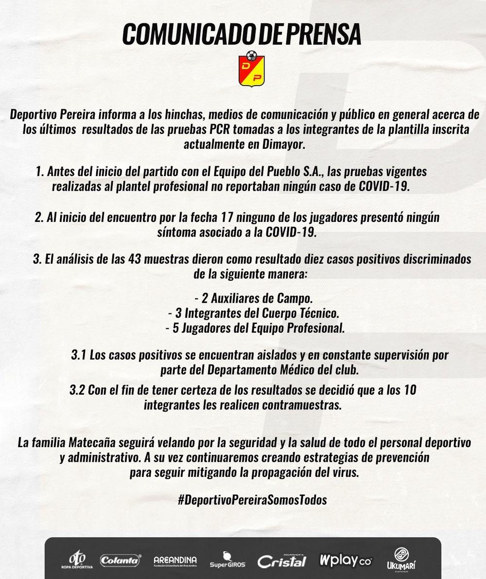 Minuto30.com- Deportivo Pereira confirmó a través de un comunicado que tiene en sus filas un alto número de contagiados de Covid-19.
