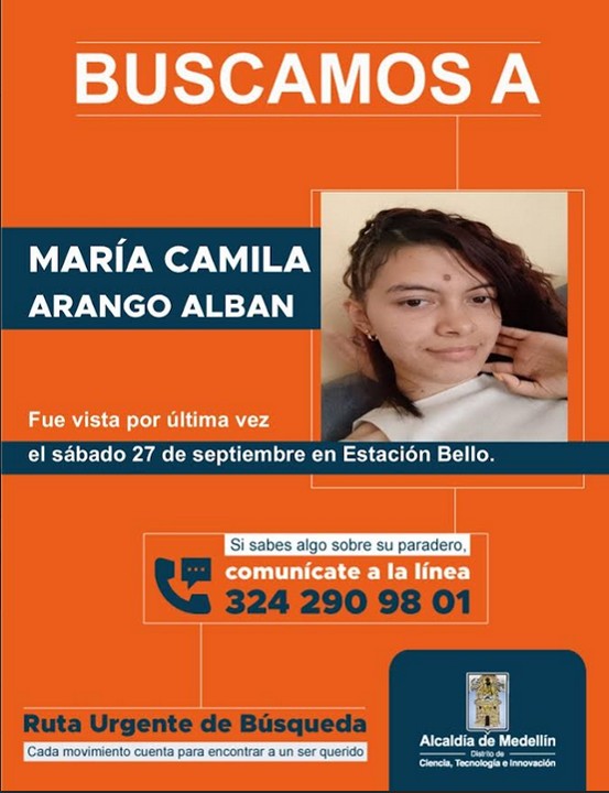Minuto30.com .- La angustia crece en el Valle de Aburrá. Familiares y amigos de María Camila Arango Albán, una joven de 23 años, claman por ayuda para encontrarla tras su misteriosa desaparición en Bello, Antioquia.