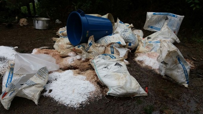 Así mismo fueron hallados para la producción de la droga una prensa, 9 canecas plásticas, dos canecas metálicas, tres bidones, un colador, una manguera de 8 metros y 15 costales vacíos.