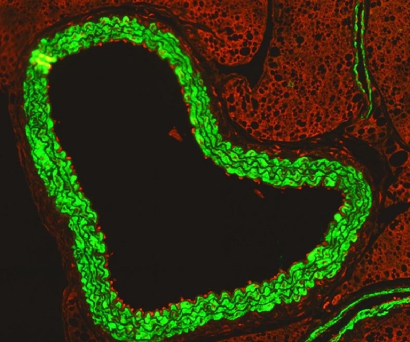 Imagen de microscopía de inmunofluorescencia que muestra cómo las células inmunes activadas (rojo) “se pegan” al interior de la aorta (verde) durante la infección de gripe en el embarazo. EFE/Universidad RMIT