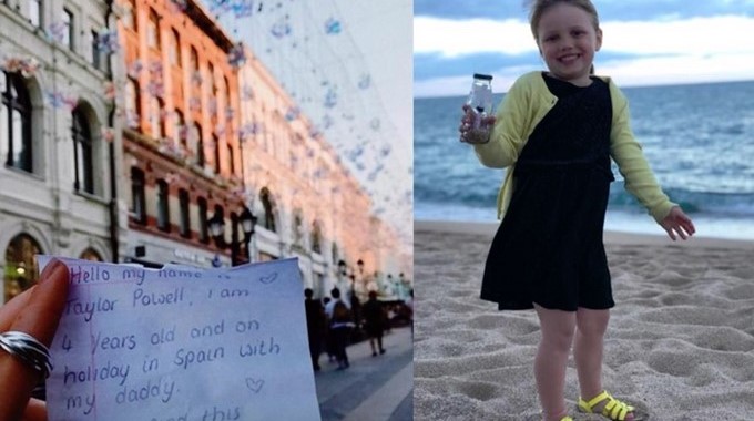 Ella metió en la botella una foto donde salía con su padre de vacaciones el pasado 19 de mayo en Santa Susanna, al norte de Barcelona, y una nota que decía, “hola, mi nombre es Taylor Powell. Tengo 4 años y estoy de vacaciones en España con mi papá. Si encuentras esta foto, por favor responde con el nombre de tu país y una imagen”.