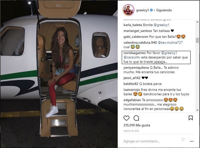 En una de sus más recientes publicaciones, Greeicy compartió una foto tomada en la avioneta de regreso después de su asistencia a Valledupar. La reconocida actriz y cantante respondió un comentario de Pipe Bueno y es esta respuesta la que tiene a sus seguidores bastante intrigados.