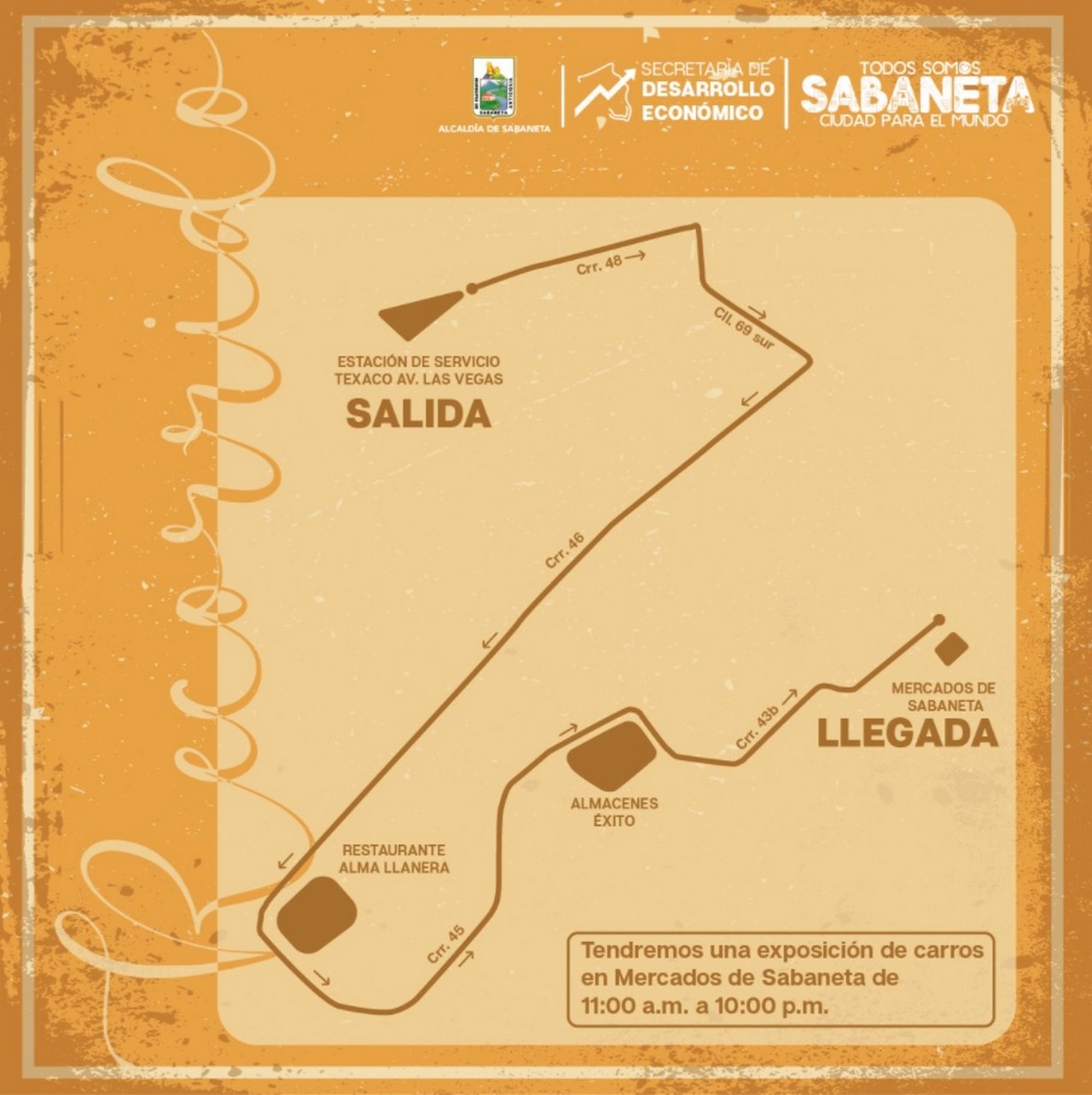 El desfile se llevará a cabo a las 10:00 a.m. e iniciará en la Estación de Servicios Texaco de la Avenida las Vegas, hasta Mercados de Sabaneta, donde se tendrá una exposición de carros hasta las 10:00 p.m.