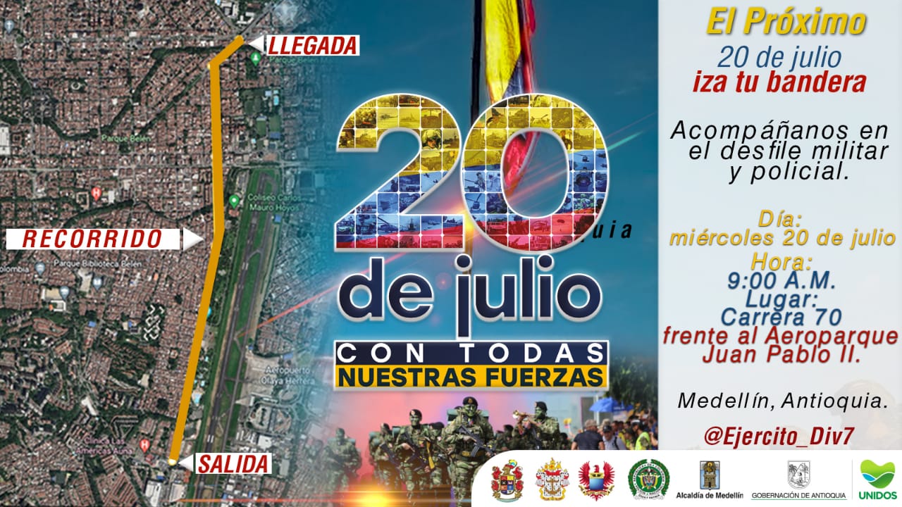 Este miércoles 20 de julio las calles de Medellín conmemorarán los 212 años de independencia con el tradicional desfile militar y policial, el cual contará con la participación de la fuerza pública conformadas por el Ejército Nacional, representado en la Séptima División, la Armada Nacional, la Fuerza Aérea Colombiana y la Policía Nacional, junto a las escuelas de formación, bomberos, y la Defensa Civil, entre otras entidades del orden departamental y municipal.