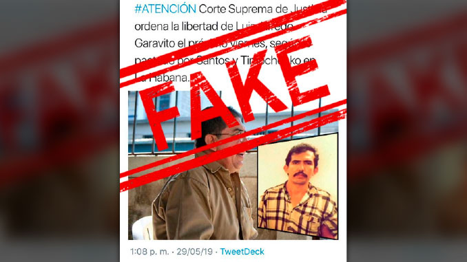 Esta cadena fue difundida en redes sociales planteando que ‘Santos y Timochenko’ habrían hecho un supuesto acuerdo para liberar a Garavito, pero se trataba de información falta en la que han creído diferentes personas.