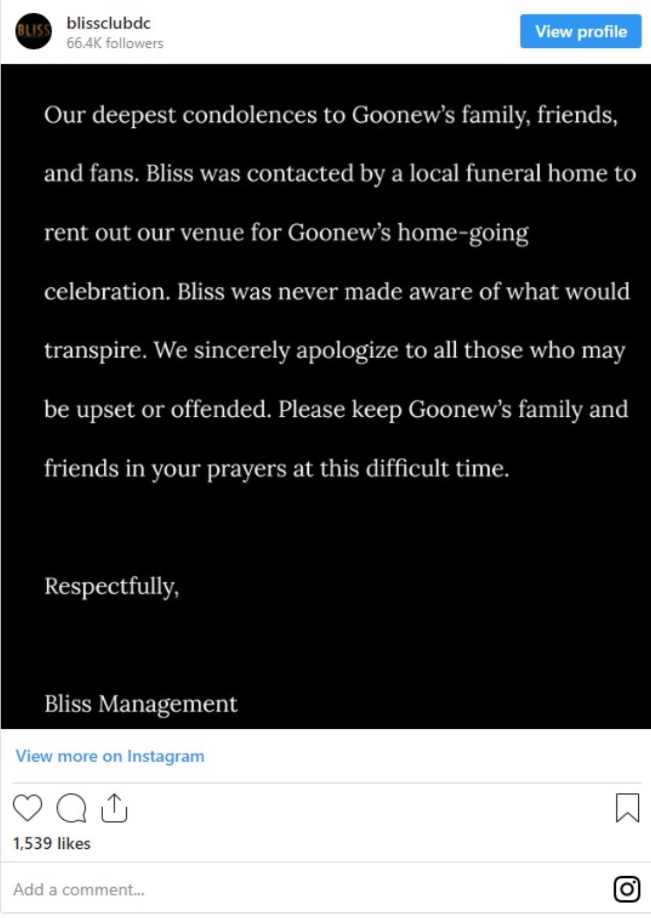Luego de que se viralizara el video en redes sociales el club donde se realizó la fiesta dijo que “Una funeraria local se puso en contacto (…) Para alquilar nuestro lugar para la celebración de regreso a casa de Goonew. Nunca se informó lo que sucedería. Nos disculpamos sinceramente con todos aquellos que puedan estar molestos u ofendidos”, se lee en un comunicado posteado en Instagram por parte del club.