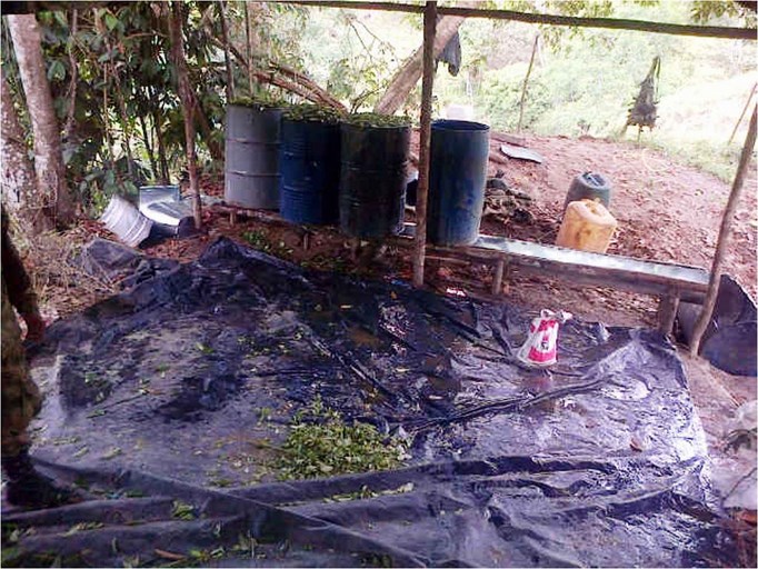 En este laboratorio se hallaron 67 kilos de pasta base de coca en proceso de solidificación, 18 galones de ACPM y 10 galones de gasolina, que fueron destruidos después de haber realizado la reseña de los insumos descubiertos.