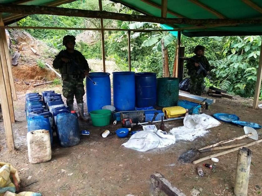 El Ejército Nacional, en coordinación con la Policía y la Fiscalía, desmanteló un laboratorio para procesar pasta base de coca en la vereda Quebrada Larga, del municipio de Nóvita, en el Chocó.