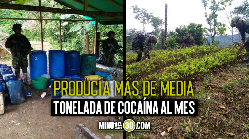 “Estas estructuras le dejaban al Frente Ernesto Che Guevara, del ELN, más de 200 millones de pesos mensuales como producto de esta renta ilícita. En el sitio fueron encontrados abundantes insumos líquidos y sólidos utilizados para la producción de pasta base de coca”, detalló el Ejército.