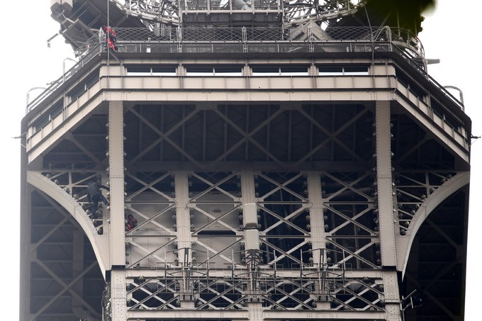 Un hombre escala la Torre Eiffel mientras varios bomberos tratan de detenerlo. EFE