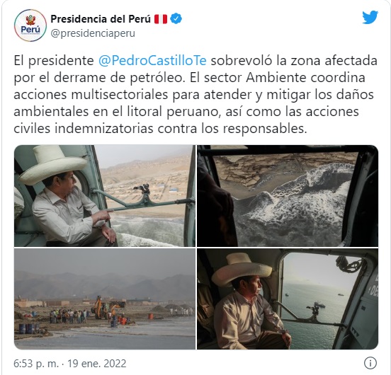 “El sector Ambiente coordina acciones multisectoriales para atender y mitigar los daños ambientales en el litoral peruano, así como las acciones civiles indemnizatorias contra los responsables”, destacó Pedro Castillo en Twitter, donde publicó unas fotos en las que aparece observando el desastre desde un helicóptero.