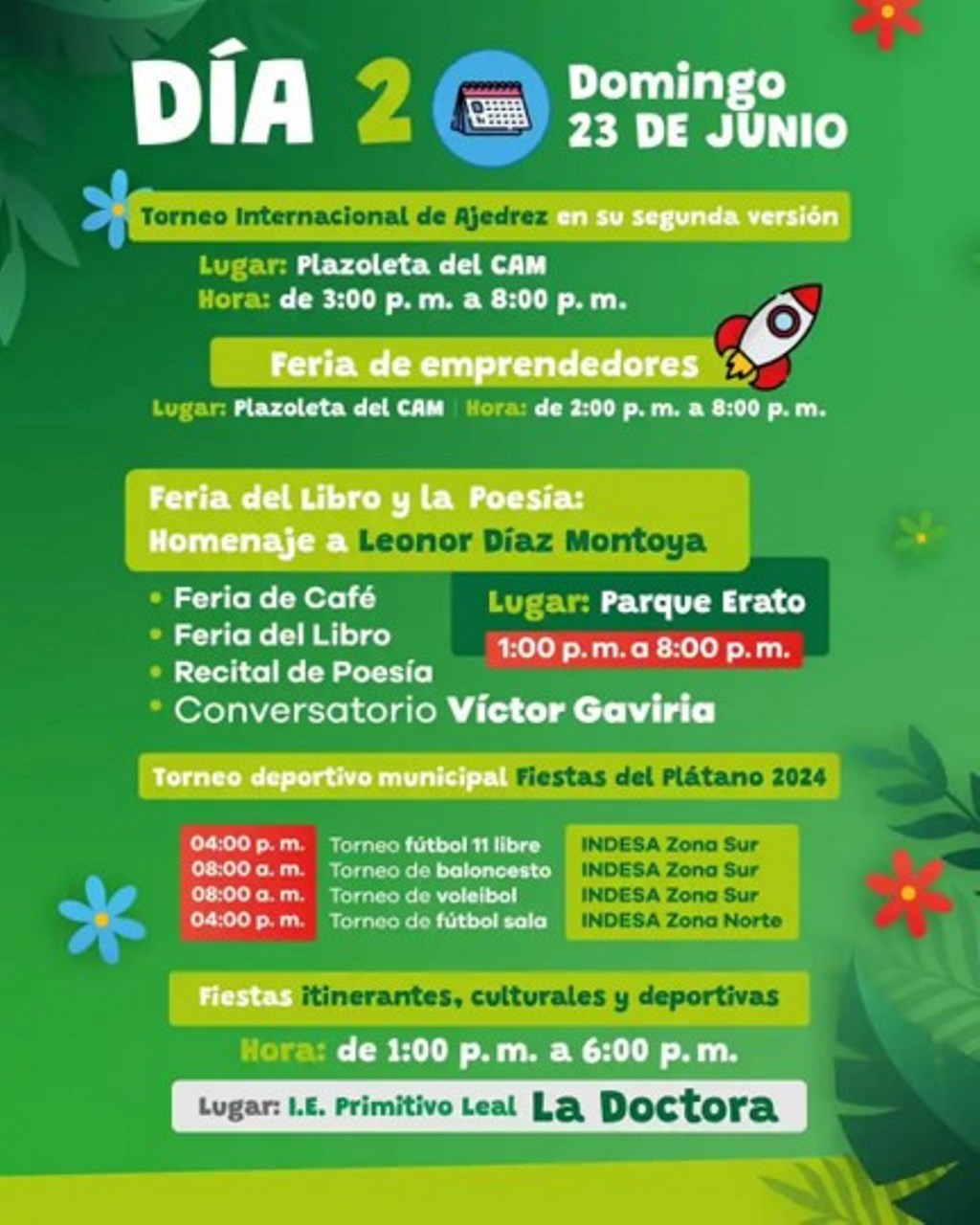 Este domingo 23 de junio hay Torneo Internacional de Ajedrez; eventos en la vereda La Doctora; fútbol en las canchas de la municipalidad. También Feria de Emprendedores y Feria del Libro y de la Poesía .