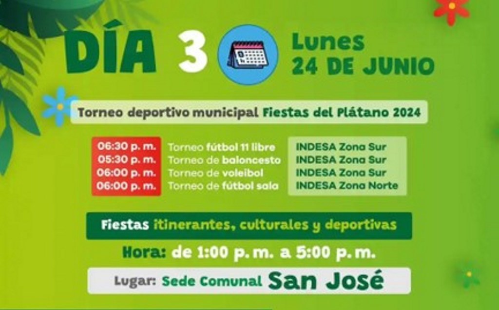 Este lunes 24 de junio hay Torneo de fúbol, baloncesto, voleyball y Futsal en los diferentes escenarios deportivos de la localidad; eventos en la vereda San José y También Feria de Emprendedores.