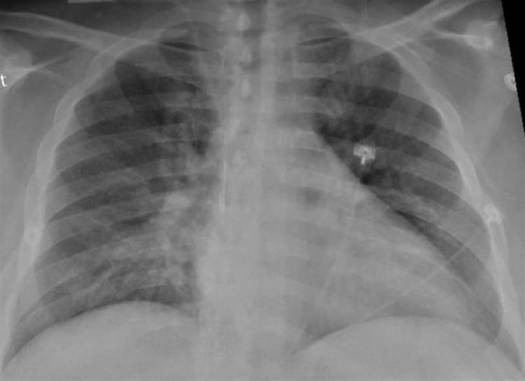 Radiografía de tórax de un paciente de SARS-CoV-2 que muestra debilidad en el lado izquierdo y una neumonía en la parte inferior de los pulmones. EFE/Sociedad Radiológica de Norteamérica