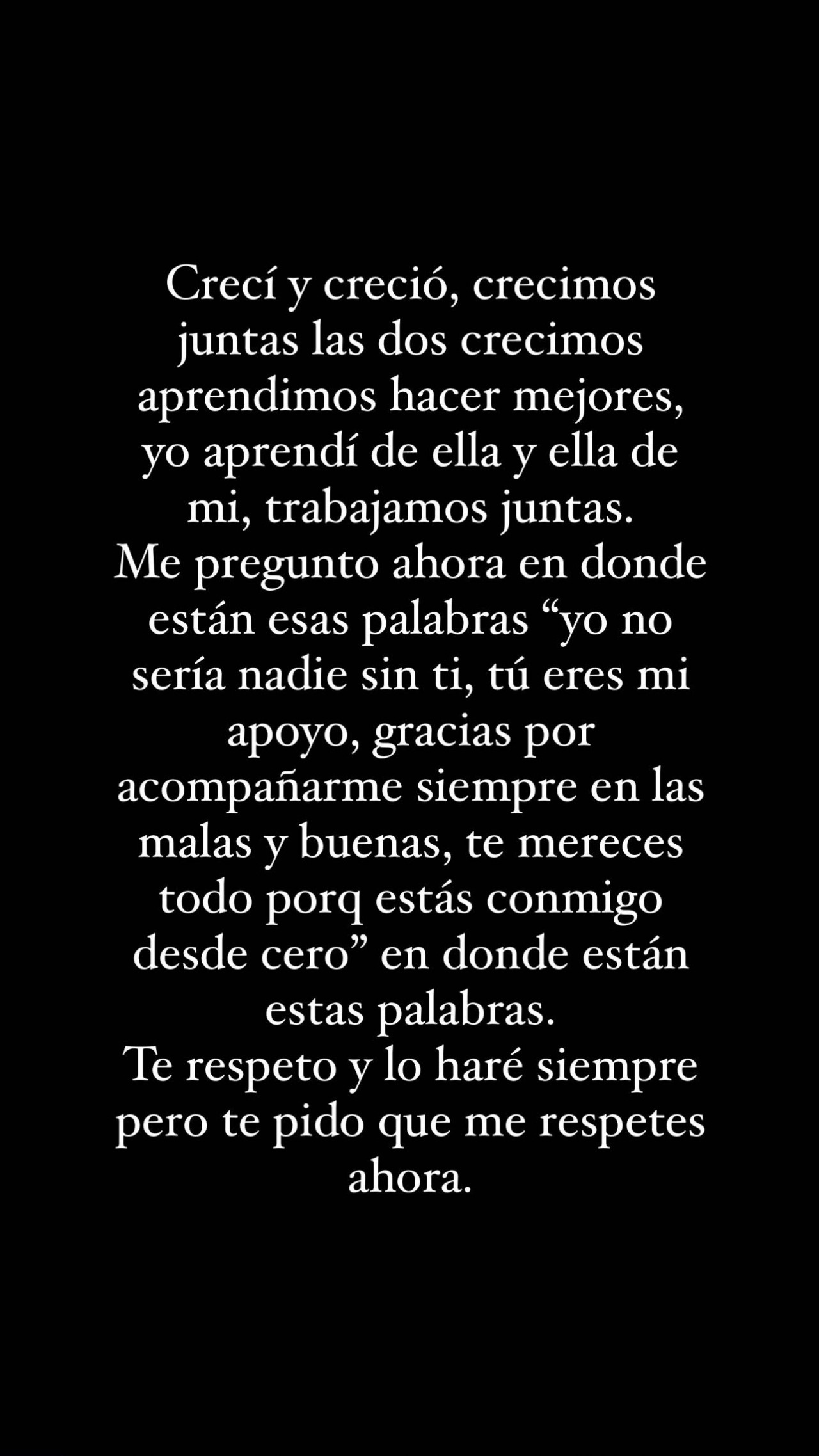 «Estuvo conmigo apoyándome, pero yo trabajé sola, ella estaba en el fútbol 24/7 y llegaba super tarde a dormir y a mí me tocaba enfrentarme a muchísimas entidades y muchísimas personas… Yo he trabajado muy duro y ella sabe que yo trabajé solita”, dijo Epa Colombia por medio de sus estados de Instagram sobre la demanda.