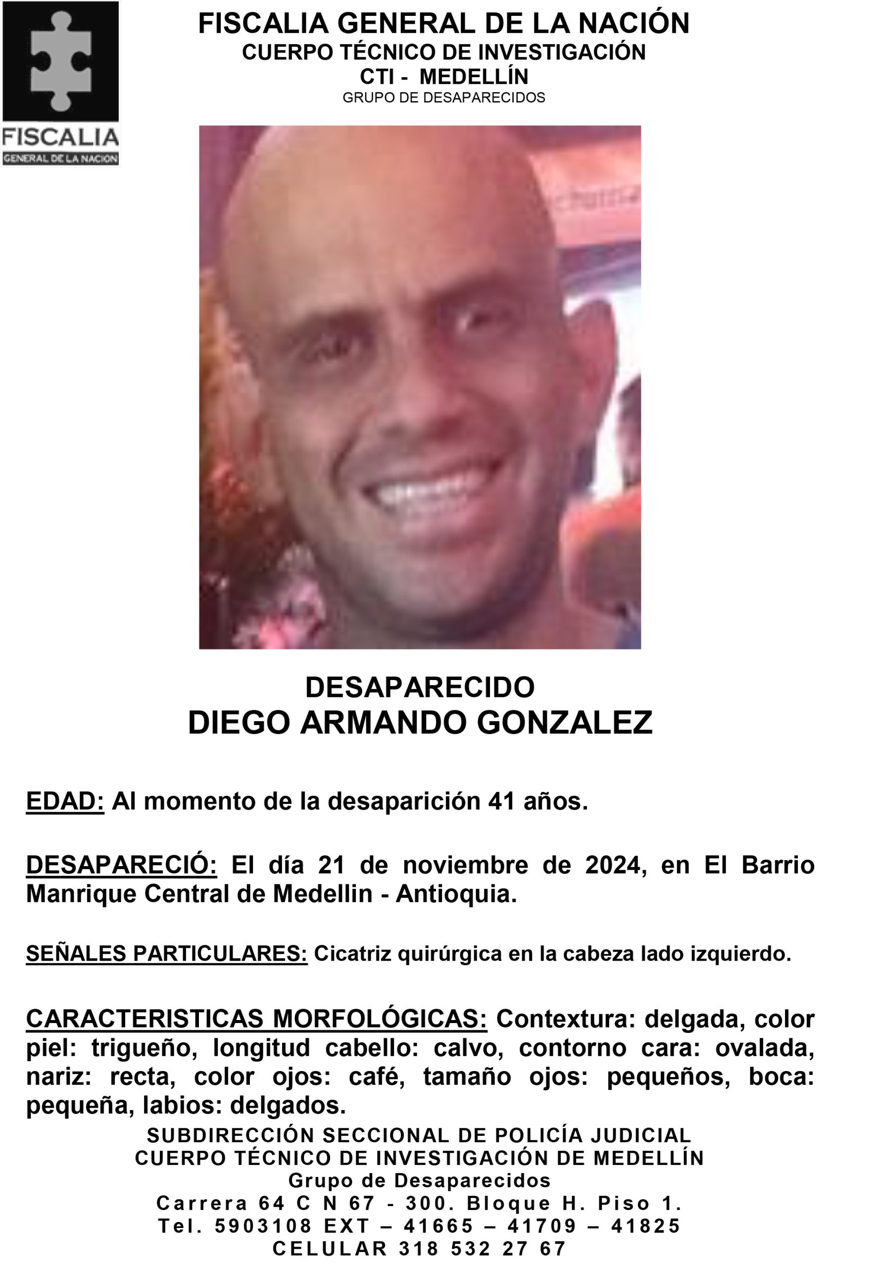Resumen: Diego Armando González, de 41 años, desapareció el 21 de noviembre de 2024 en el barrio Manrique Central, ubicado en Medellín, Antioquia.