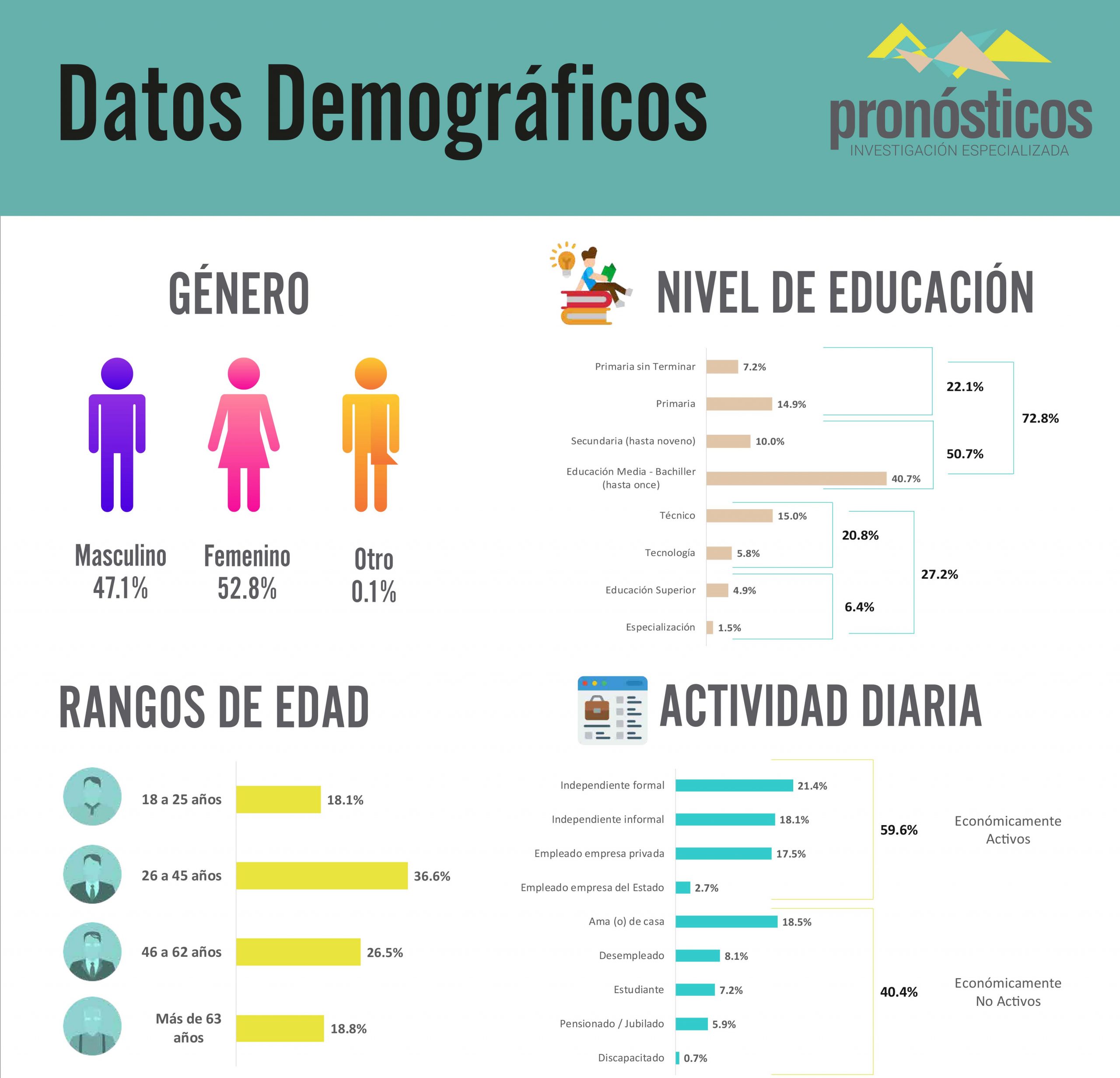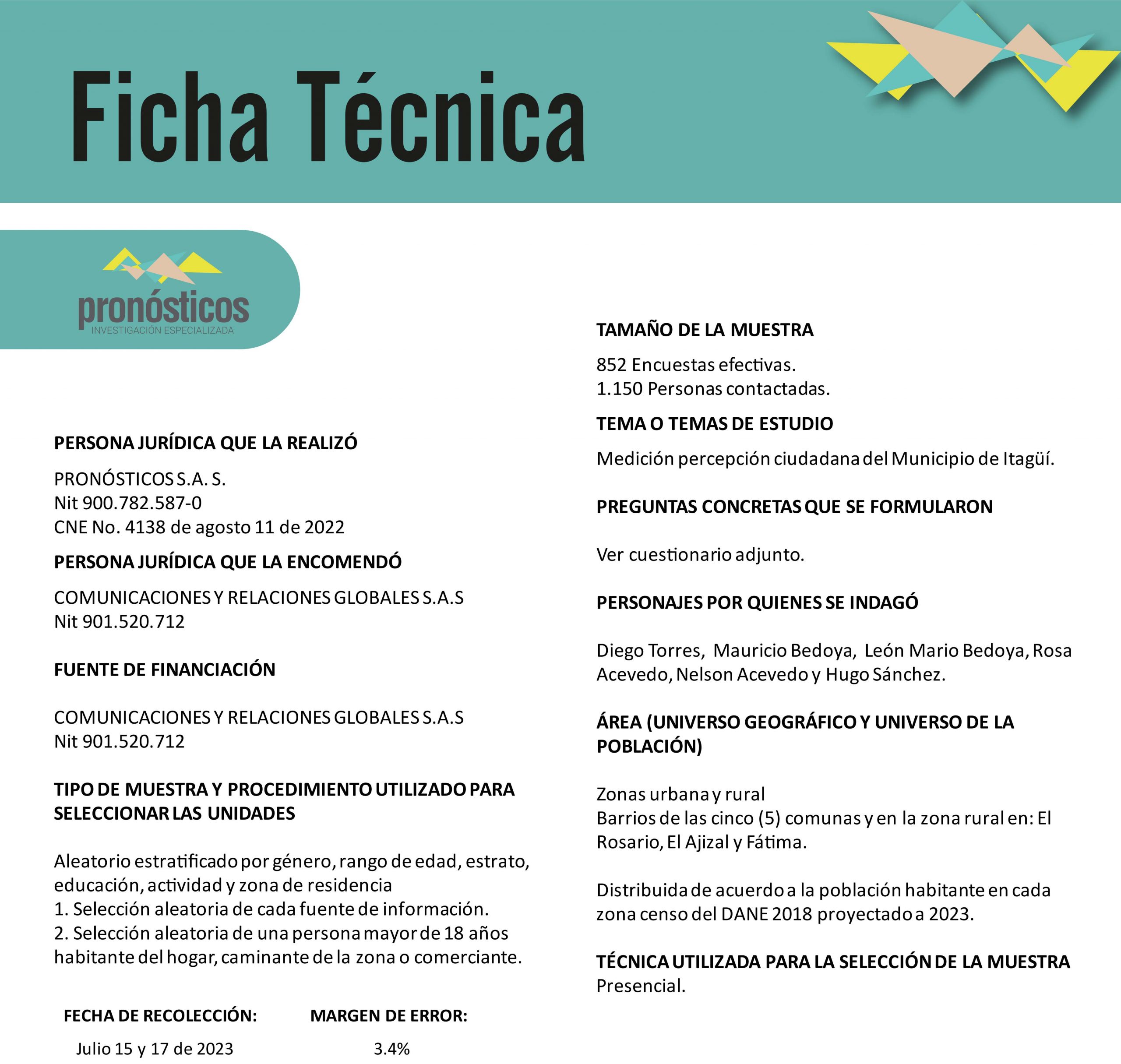 La encuesta fue realizada por la firma Pronósticos Investigación Especializada, entre el 15 y 17 de julio de 2023 con una muestra de 852 encuestas presenciales en la zona urbana y rural.