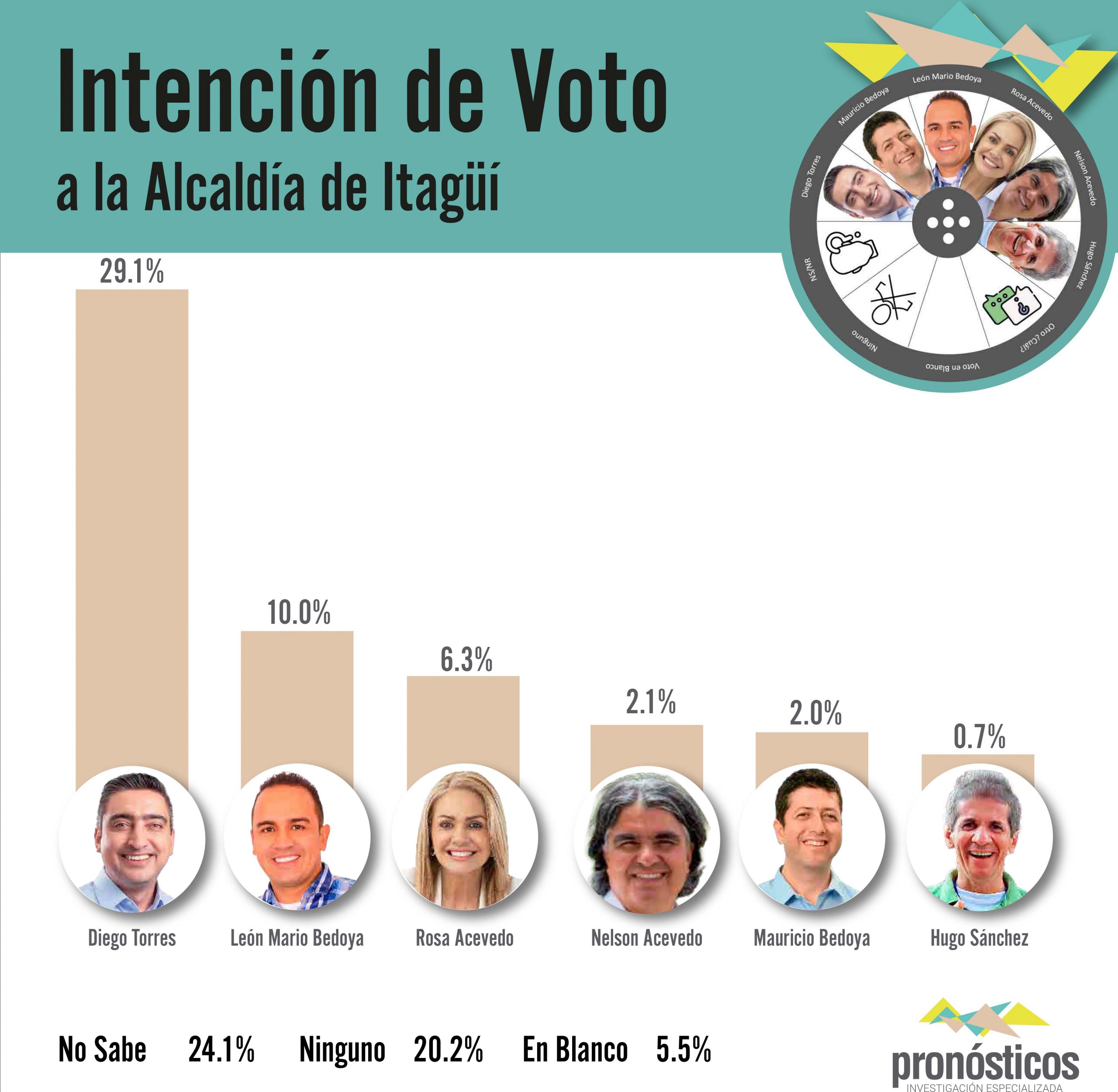 A tres meses de las elecciones del próximo 29 de octubre, las encuestas a la Alcaldía de Itagüí, siguen poniendo como primera opción al candidato Diego Torres, con el 29.1% de preferencia electoral.