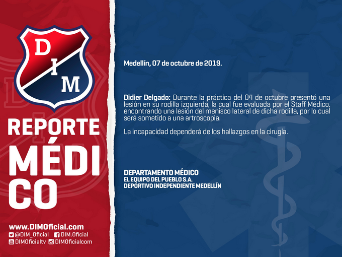El equipo médico de Independiente Medellín confirmó que Didier Delgado tendrá que pasar por el quirófano después de la lesión de rodilla que sufrió durante la semana anterior.  El ‘Podero’ detalló que durante la práctica del pasado viernes 4 de octubre, el jugador presentó una lesión en su rodilla izquierda que fue evaluada por el […]