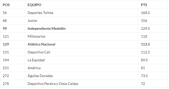 Lo que parece increíble es que equipos como Millonarios (121), Deportivo Cali (131), América (231), y hasta el actual campeón de Colombia, Atlético Nacional (129), ni siquiera están dentro de los 100 mejores equipos del mundo.