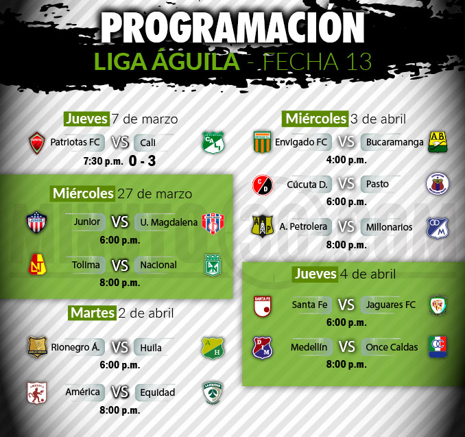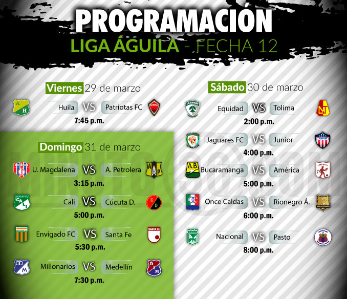 En la jornada 12 Atlético Nacional recibirá a Deportivo Pasto, el sábado 30 de marzo (8:00 p.m.) en el Atanasio Girardot; mientras que el domingo 31; Independiente Medellín visitará a Millonarios (7:45 p.m.), en El Campín.