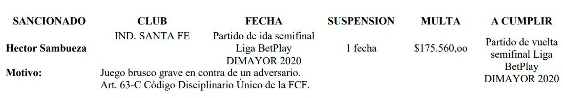 La Comisión Disciplinaria determinó que el futbolista de Independiente Santa Fe tendrá que pagar una fecha de sanción, como consecuencia de la roja que recibió en el partido de ida de la semifinal, frente a La Equidad, por “juego brusco grave en contra de un adversario”.
