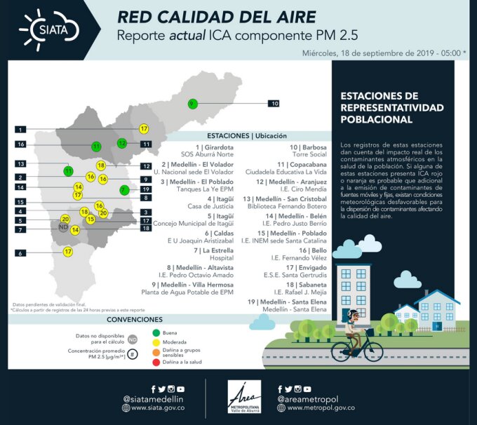 Bello, Copacabana, San Cristóbal y Santa Elena son las únicas que reportan buena calidad del aire. Es así que Medellín y la parte sur del Valle de Aburrá presentan condiciones meteorológicas desfavorables para la dispersión de contaminantes.