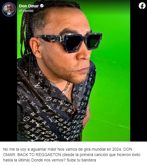 A través de su cuenta de Facebook, Don Omar escribió: “¡No me la voy a aguantar más! Nos vamos de gira mundial en 2024, DON OMAR: BACK TO REGGAETON (desde la primera canción que hicieron éxito hasta la última) ¿Dónde nos vemos? Sube tu bandera”