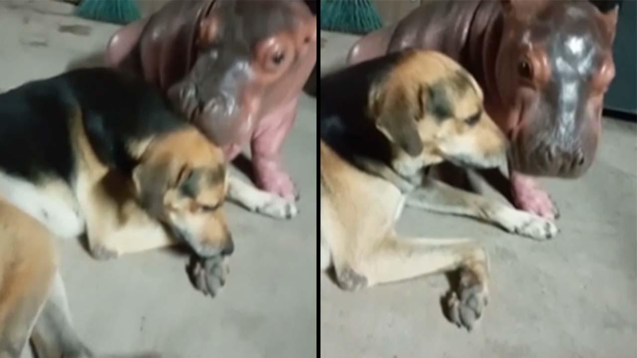 En redes sociales se hizo viral un tierno video que fue grabado en Doradal, donde se le ve aun perrito y a un hipopótamo bebé compartir el mismo espacio y hasta darse un par de lengüetazos.