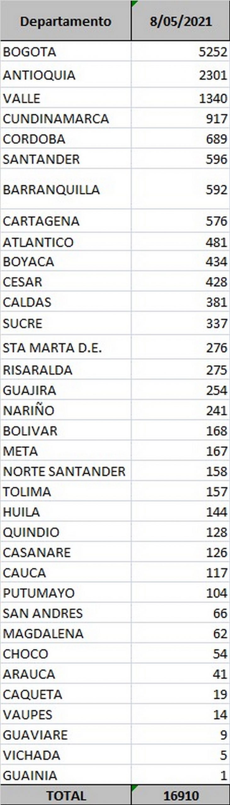 El Ministerio de Salud entregó nuevas cifras con el número de casos nuevos de Covid-19 en el país, y este sábado 8 de mayo, además de tener 16.910 casos nuevos, Colombia reportó 492 fallecidos.