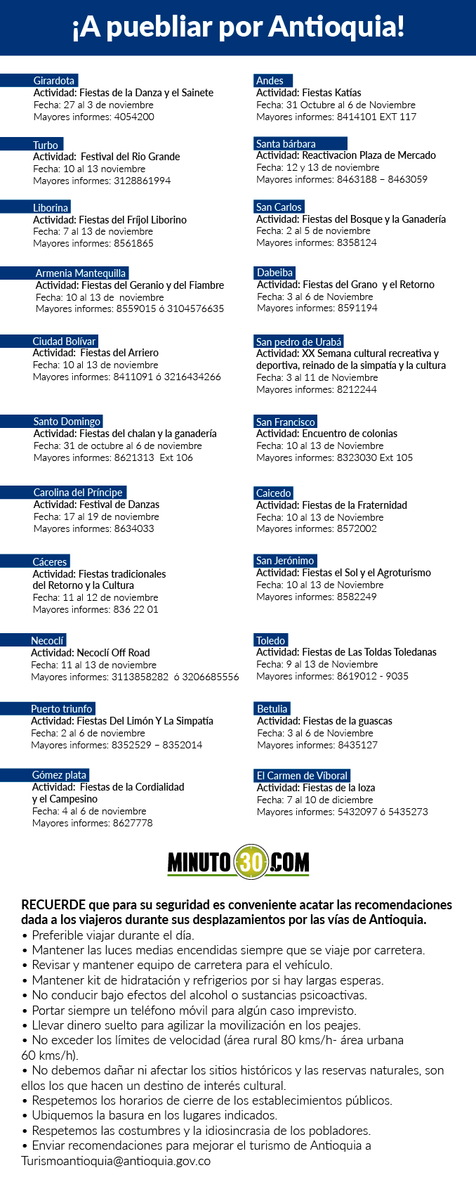 El mes de noviembre contará con dos puentes festivos seguidos, para que puedas aprovechar y agendart traemos información detallada para que encuentres plan sin salir del departamento de Antioquia.