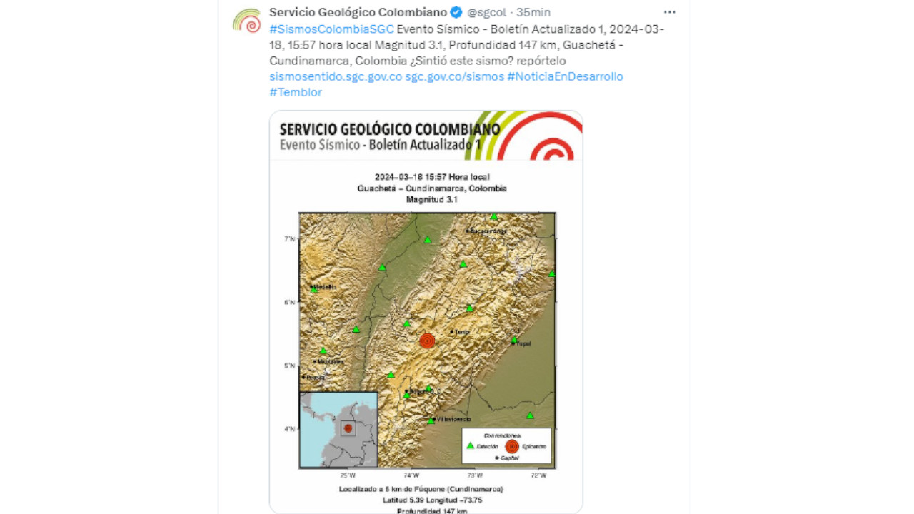 El segundo evento sísmico ocurrió magnitud 3.1, profundidad 147 km, en Guachetá – Cundinamarca.