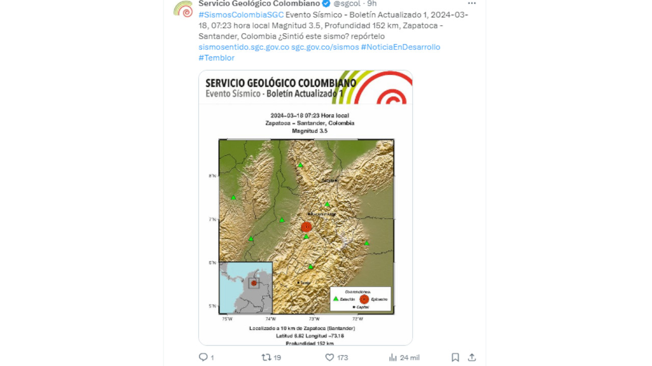 Mientras que el primer sismo fue a las 7:23 de la mañana con magnitud 3.5, profundidad 152 km en Zapatoca – Santander.