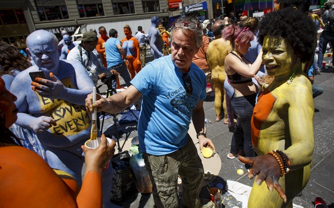 Unas doscientas personas desnudaron su cuerpo y también sus emociones en la concurrida plaza de Times Square en Nueva York, donde se celebró una exhibición de pintura corporal, en la que cada modelo lució sus sentimientos escritos sobre la piel.