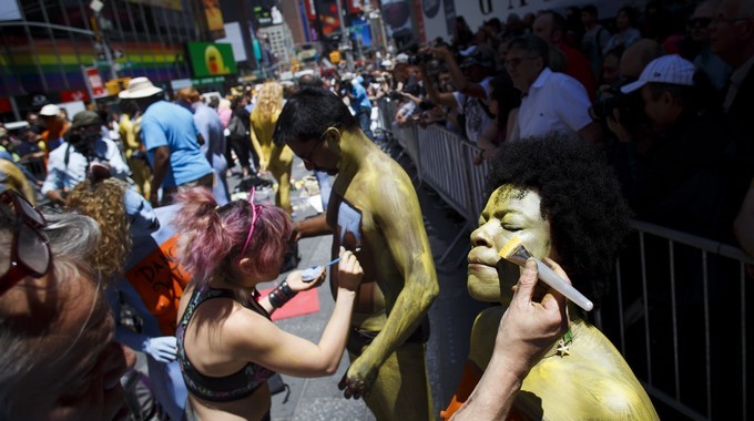 “Esto solo lo ves en Nueva York. No es para débiles de corazón, desde luego”, comentó Patrick Wells, un turista de Massachusetts que observaba entre los curiosos y para quien las reacciones del público eran igual de interesantes que los desnudos.