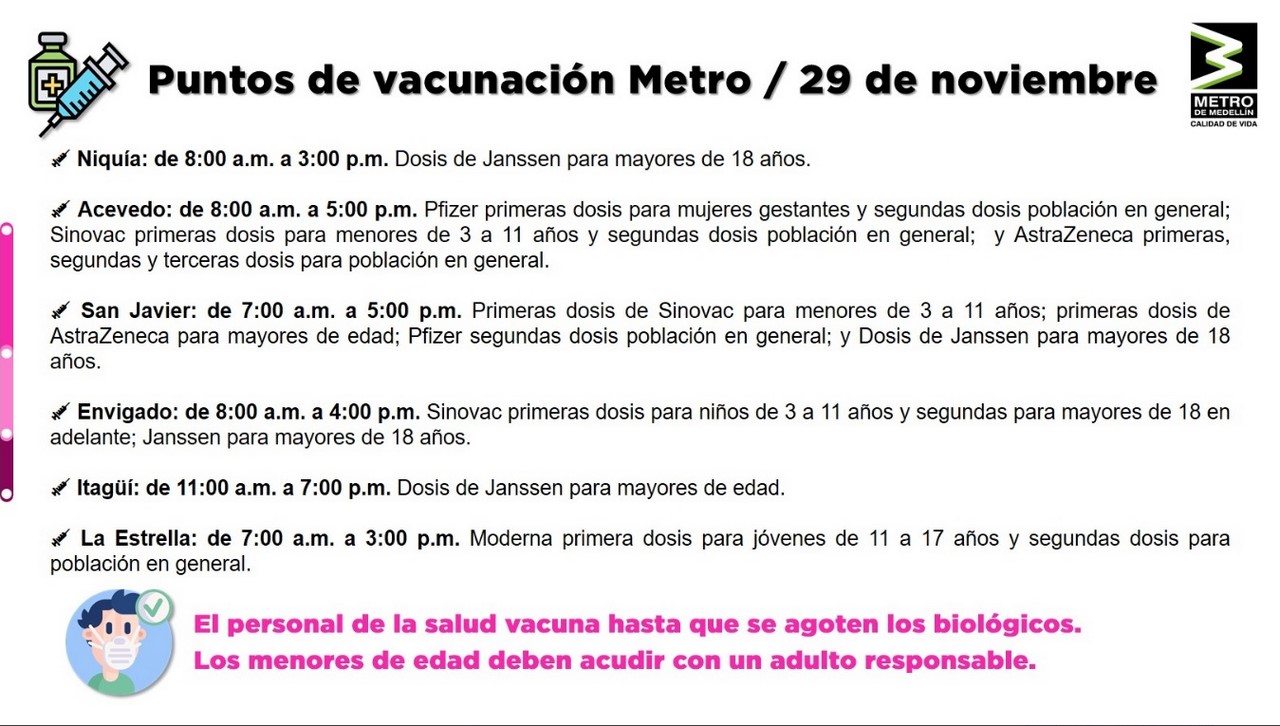 Niquía, Acevedo, San Javier, Envigado, Itagüí, La Estrellas, son las estaciones donde hay vacunas contra el covid-19.