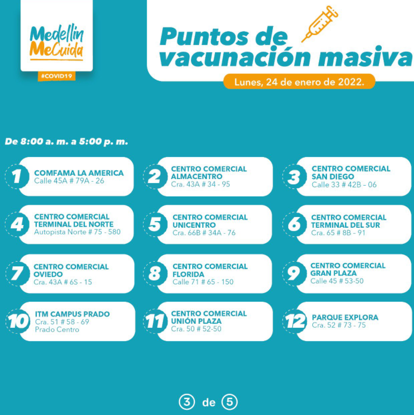 Conoce las s disponibles y los puntos habilitados a los que puedes acceder para vacunarte contra la #COVID19. #VacunaciónMedellín. pic.twitter.com/JkZomU0lAj— Alcaldía de Medellín (@AlcaldiadeMed) January 24, 2022