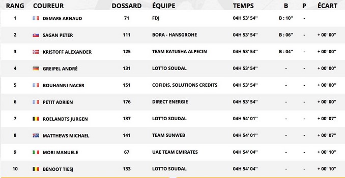 Demarre aventajó al noruego Alexandre Kristoff y al eslovaco Peter Sagan, que sacó el codo derecho en los últimos metros y derribó al británico Mark Cavendish.