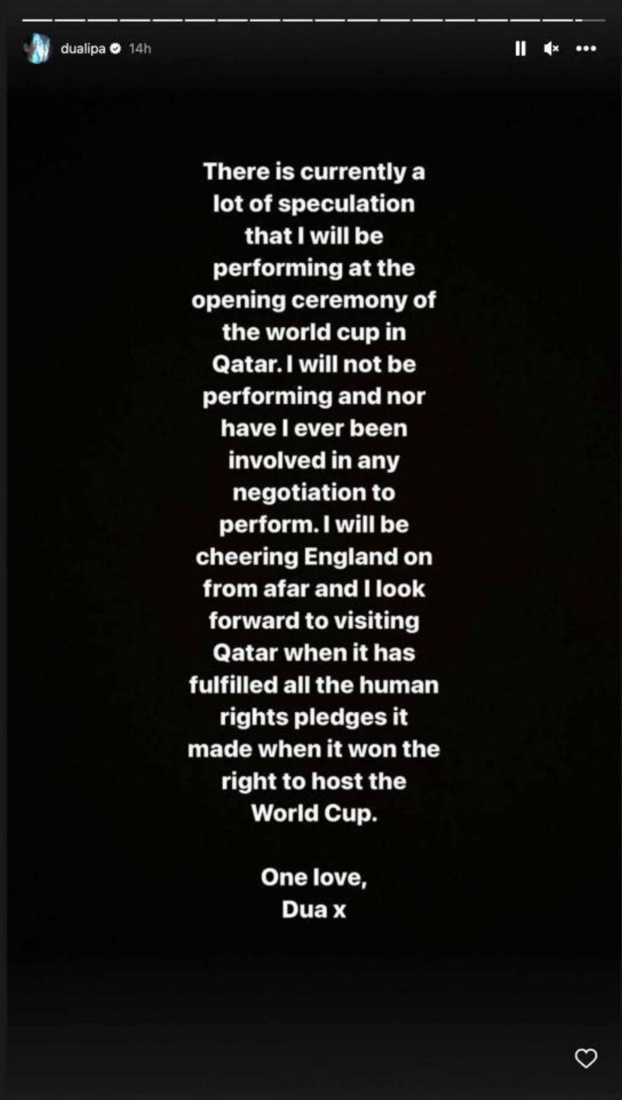 Y agregó: “Estaré animando a Inglaterra desde lejos y espero visitar Qatar cuando haya cumplido todas las promesas de derechos humanos que hizo cuando ganó el derecho a albergar la Copa del Mundo. Un abrazo, Dua x”.