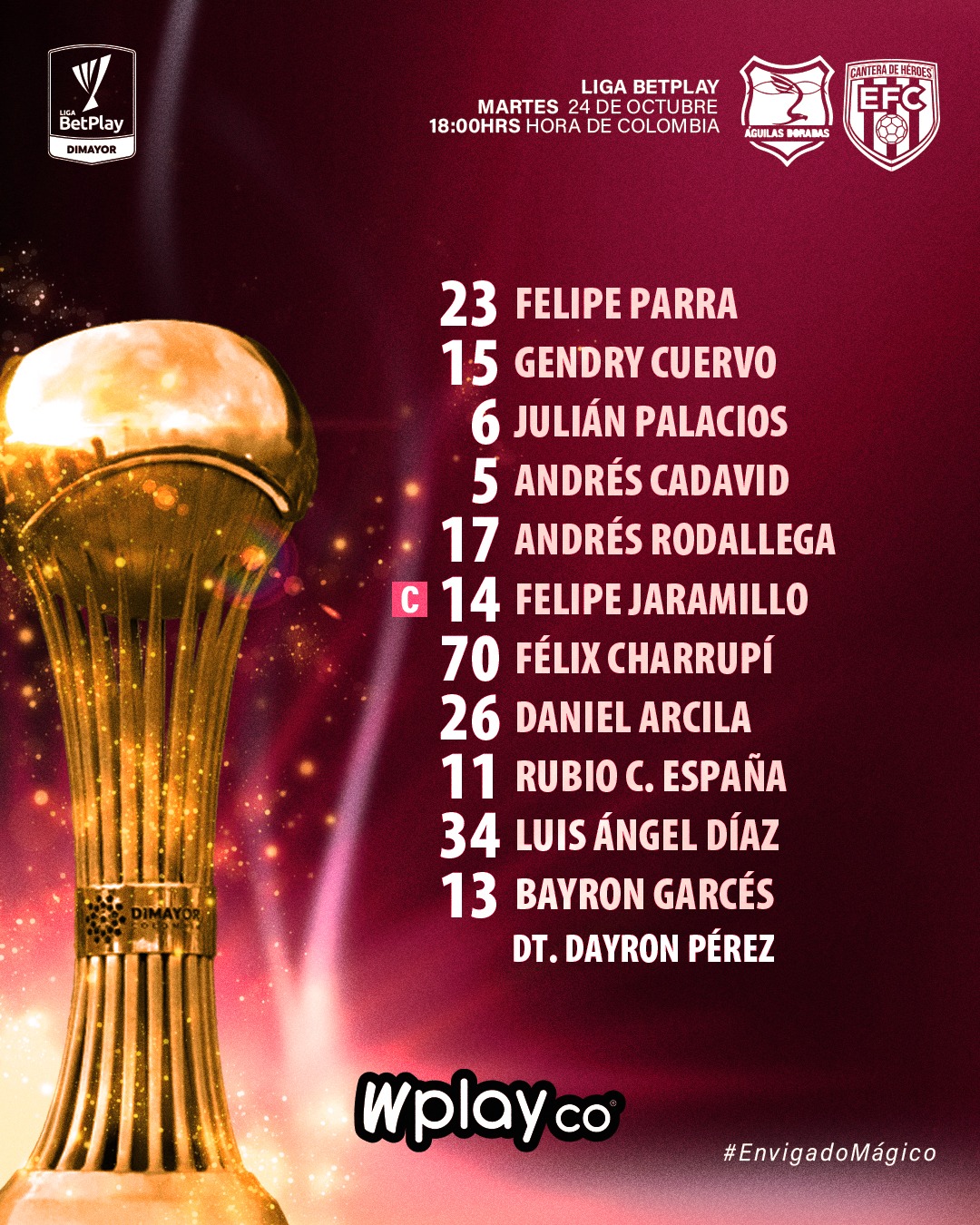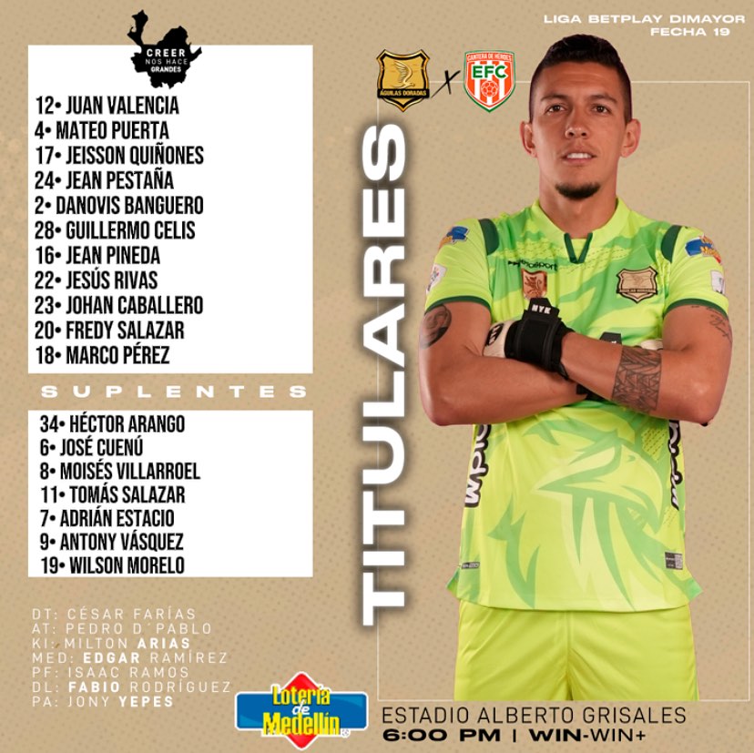 Águilas Doradas invicto en el campeonato, con 38 puntos luego de 10 victorias y 8 empates formará con Juan Valencia, Mateo Puerta y Jeisson Quiñones.